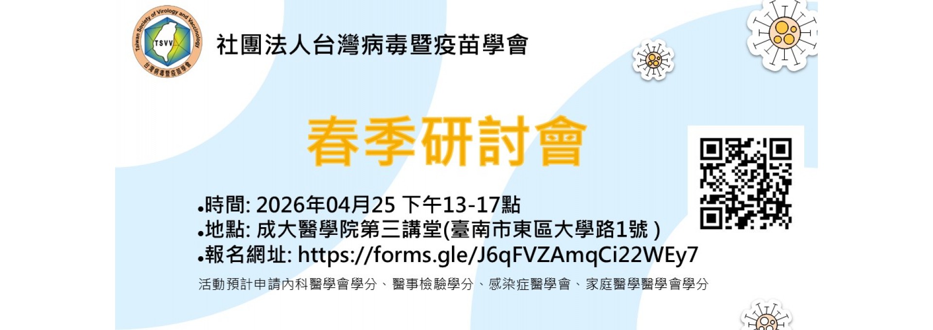 社團法人台灣病毒暨疫苗學會將於2026年04月25日(六),舉辦2026年 春季研討會,誠摯邀請您踴躍參與。 ***此次研討會採預先報名方式,會員免繳