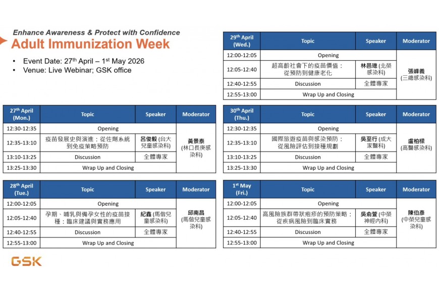 在這一週的講座中,我們將從疫苗發展到臨床應用,深入探討孕婦、高齡、國際旅遊及高風險族群的最新預防策略,並透過專業講師的分享,了解在實務上如何在關鍵時機向民眾傳遞預防認知。