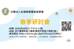 社團法人台灣病毒暨疫苗學會將於2026年04月25日(六),舉辦2026年 春季研討會,誠摯邀請您踴躍參與。 ***此次研討會採預先報名方式,會員免繳交報名費,非會員需繳交報名費300元。 ..→